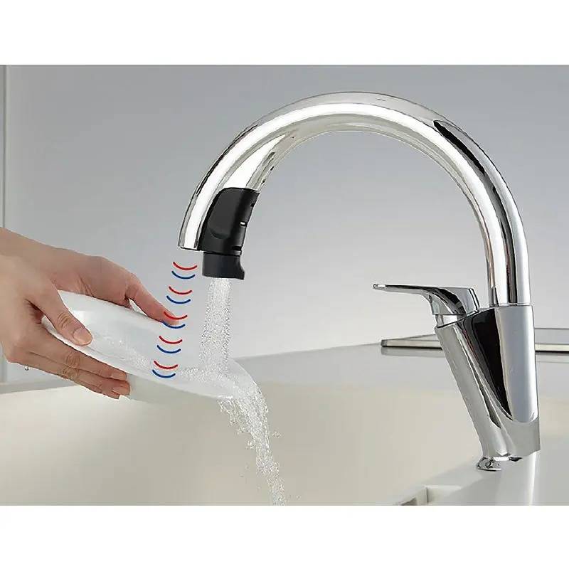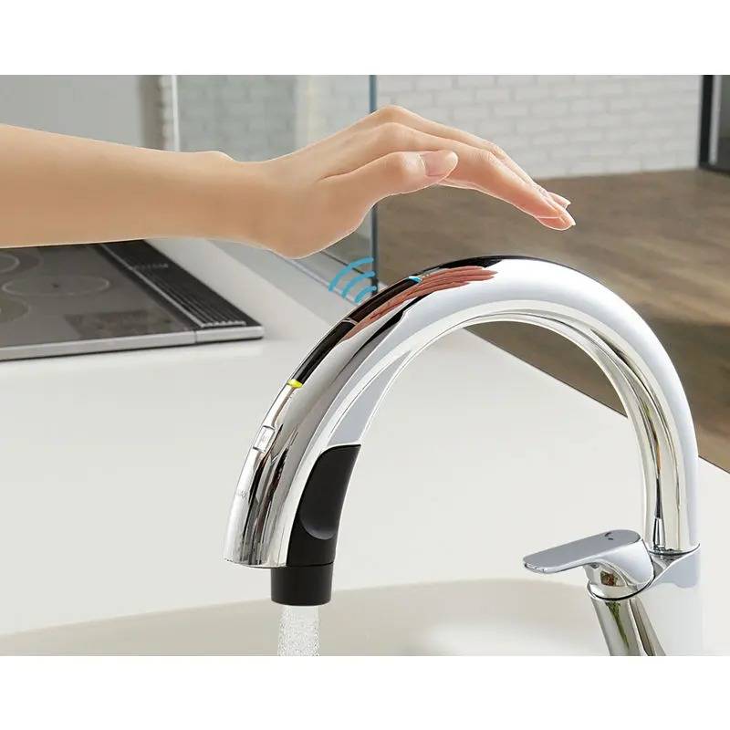 センサーが手の存在を検知して、手を触れずに水の吐水や止水ができる水栓で