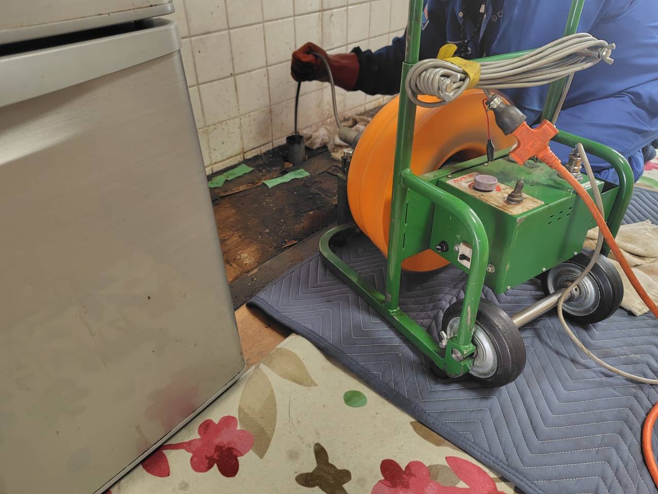 発動機を使った超高圧洗浄やトーラーを使って詰まっている物を砕いて通貫します。