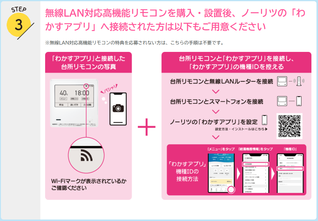 キャンペーン期間中に、ノーリツの対象商品(給湯機器・厨房機器)を購入・設置・アプリ接続で
