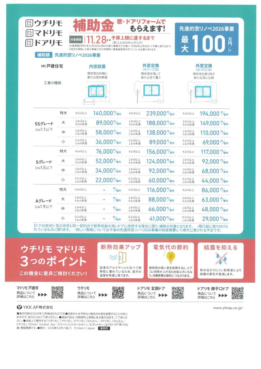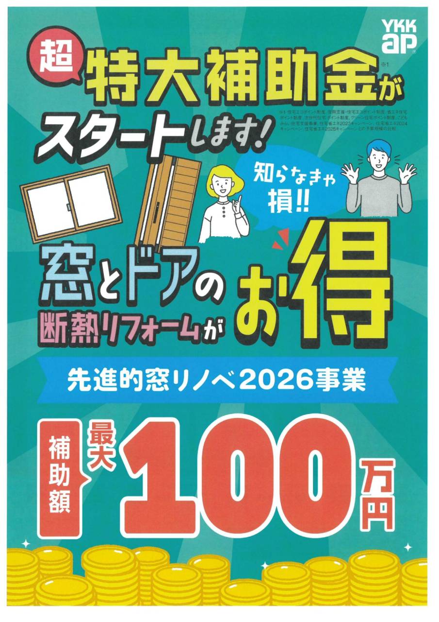 2026年に実施される先進的窓リノベ2026の補助金額の情報が